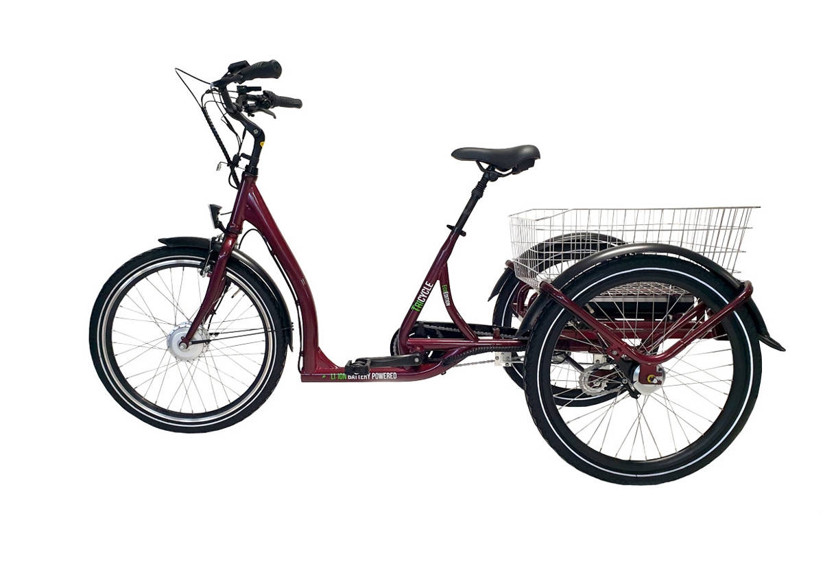 Trójkołowiec rehabilitacyjny na stalowej ramie, z regulacją kąta bocznego przechyłu, która zwiększa bezpieczeństwo jazdy na zakrętach.